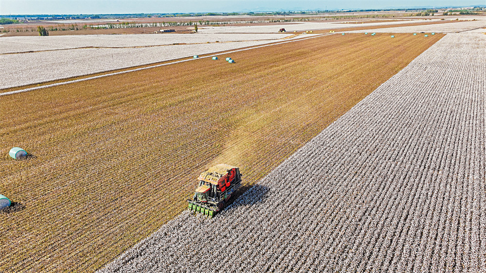 当前,我州棉花采收接近尾声,棉农抢抓晴好天气采收棉花,确保朵絮归仓。如今,机械取代人工,1台采棉机日采数百亩,效率抵百名人工,背后是“合作社+农户”模式支撑,尽显博州农业现代化成效。 (记者于苏甫·艾尼 摄)