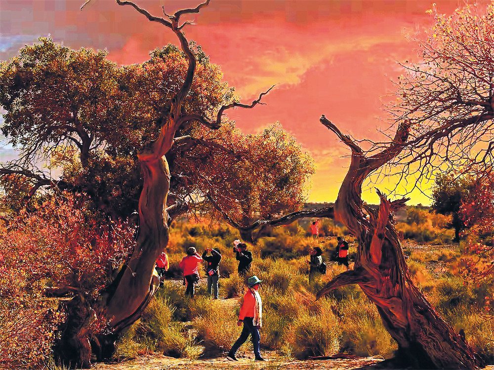 10月19日,游客在艾比湖胡杨林中流连忘返。