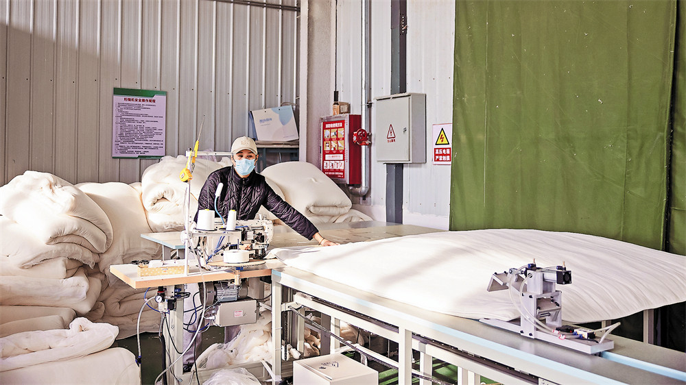 “我们的网套采用优质皮棉,经六道除杂工艺后叠成千层棉,再通过针刺机与精致绗缝工艺固定成型。”聚鑫家美公司办公室主任李杰满脸自豪,这样制成的棉被保暖性强、不易变形,夏凉被更是可直接水洗,深受市场青睐。作为2022年7月投入运行的合资企业,聚鑫家美由博乐市聚鑫棉业与三个村集体(贝林哈日莫墩乡决肯村、吉翁村、乌日木则格得村)携手创办,拥有两条大型自动化絮用纤维制品流水线及多台配套设备,产品涵盖棉胎、网套、绗缝被、学生公寓系列、民政救灾系列等100余个品种,真正实现了“从田间到床头”的全链条生产。