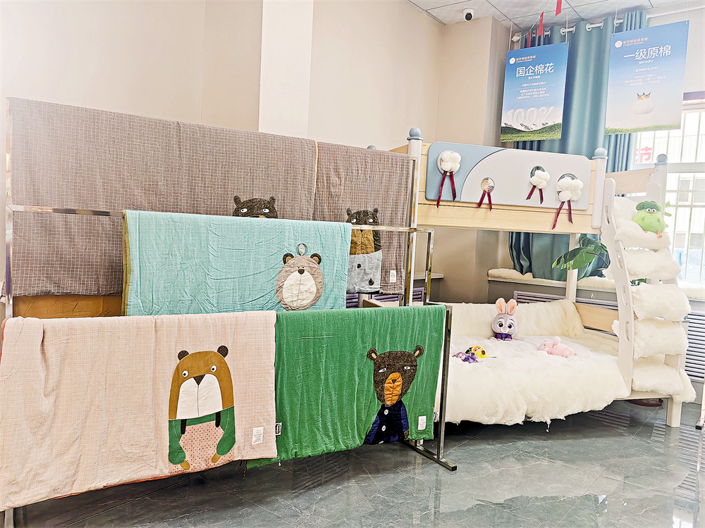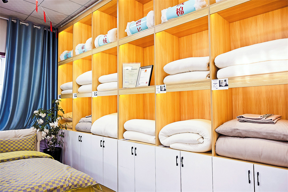 在公司商品展示馆内,2至6公斤不同规格的网套蓬松柔软,触感丝毫不输高档羽绒被;精致的床品套件、花色各异的空调被错落摆放,就连展厅内的装饰花束,都是用棉朵精心制成,满室馨香中透着质朴匠心。曾经带着“土味”的网套,如今凭借精良做工与优质用料,成为兼具实用性与美观度的家居好物。
