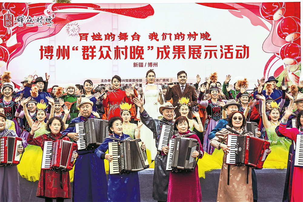 当日,博州“群众村晚”成果展示活动在博乐市青得里镇阿里翁白新村热闹启幕,为各族群众献上一场兼具文化味与烟火气的盛宴。博州“群众村晚”文体系列活动自2023年底启动以来,已举办超1500场文体活动,成为群众喜爱的文化品牌。