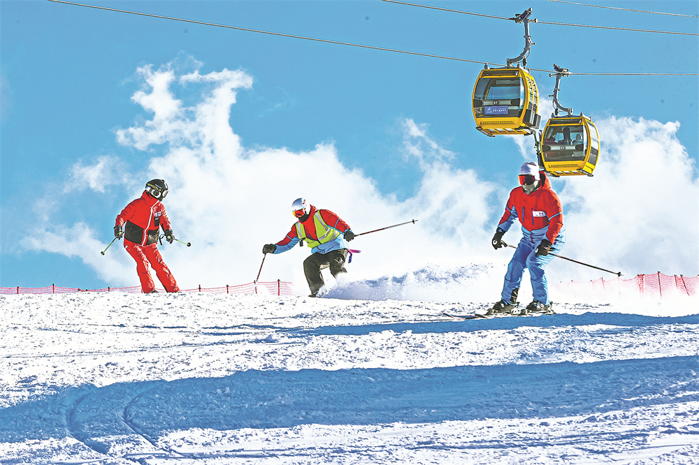 赛里木湖滑雪场毗邻赛里木湖景区,规划总面积40.1平方公里,最高海拔3539米,是国内平均海拔较高的滑雪场之一。游客可乘缆车至海拔3500米的观景台,饱览“雪场+山地+湖景”的壮丽风光。 (记者于苏甫·艾尼 摄)