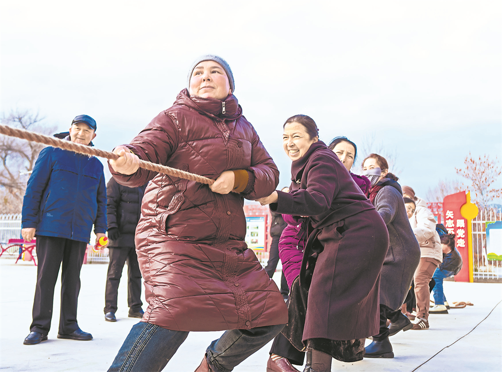 11月17日,精河县大河沿子镇呼和哈夏北村村民参与拔河比赛。