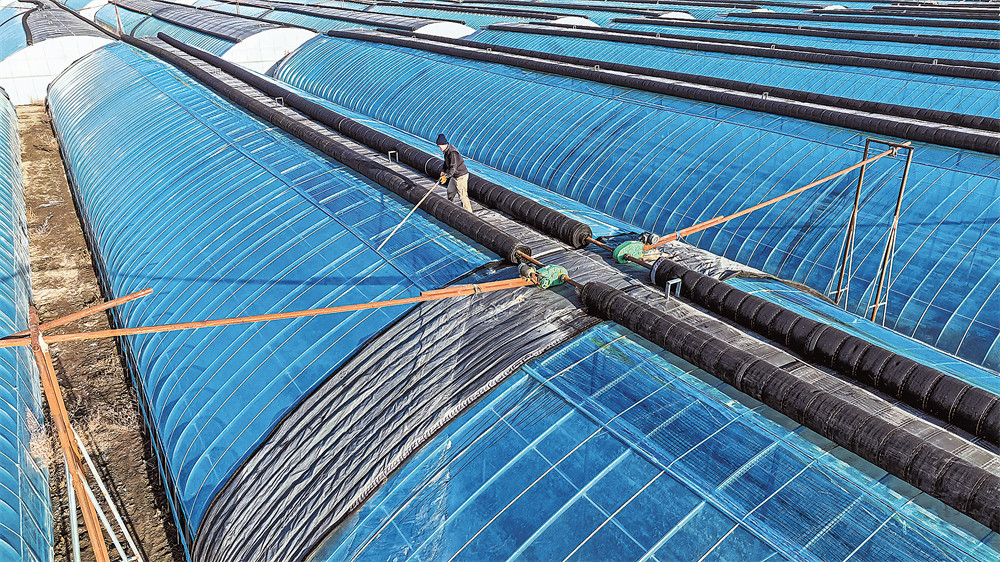 11月21日,博乐市贝林哈日莫墩乡2025年辣椒产业基础设施以工代赈项目现场,承包户调试大棚设备。