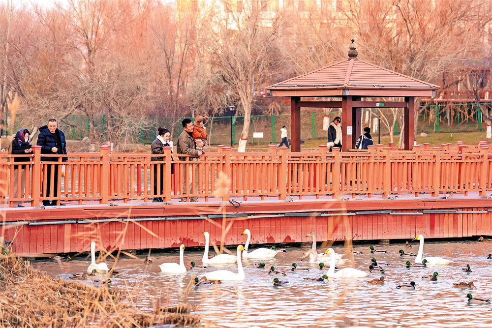 12月4日,市民在博乐市滨河公园观赏天鹅。