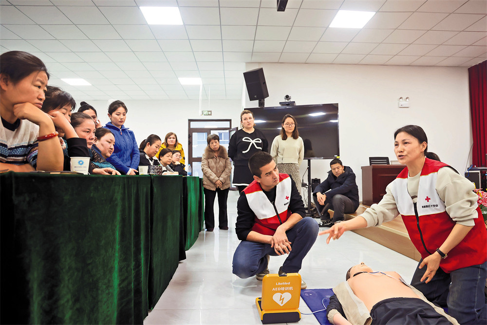 “双手交叠,垂直按压,频率保持在每分钟100至120次……”12月4日,精河镇友好社区三楼会议室,正在进行应急救护培训。讲师通过理论讲解与模拟实操,系统讲解心肺复苏、创伤包扎等急救技能,辖区干部群众踊跃参与互动。