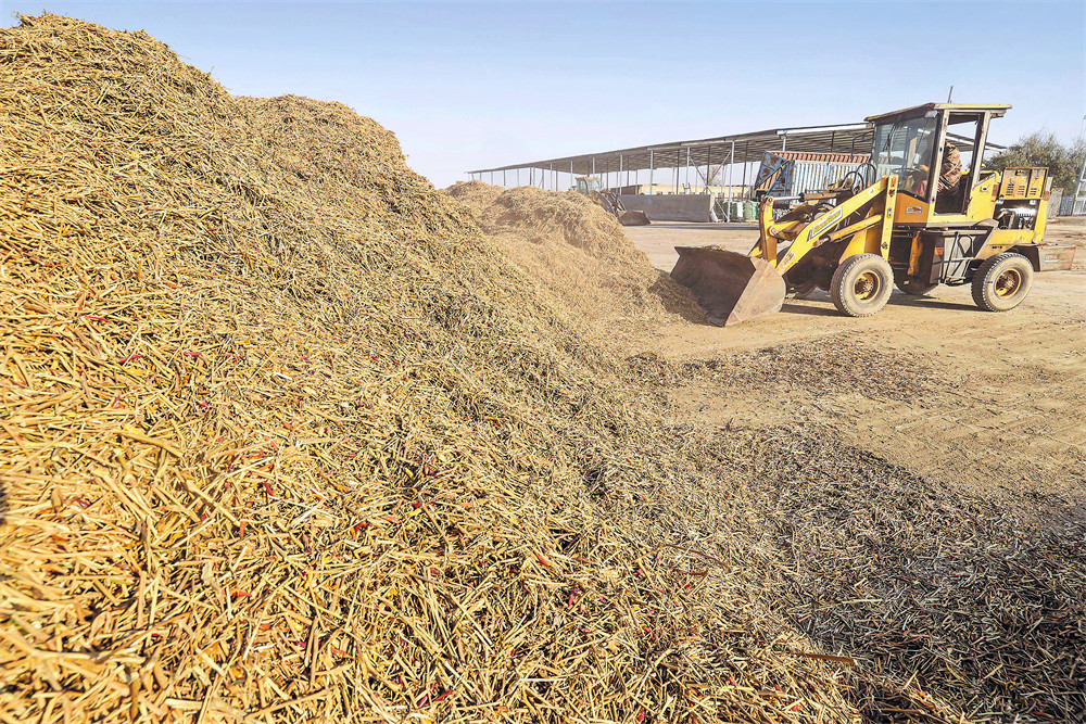 12月11日,博乐市贝林哈日莫墩乡春喜养殖农民合作社社员整理辣椒秸秆。