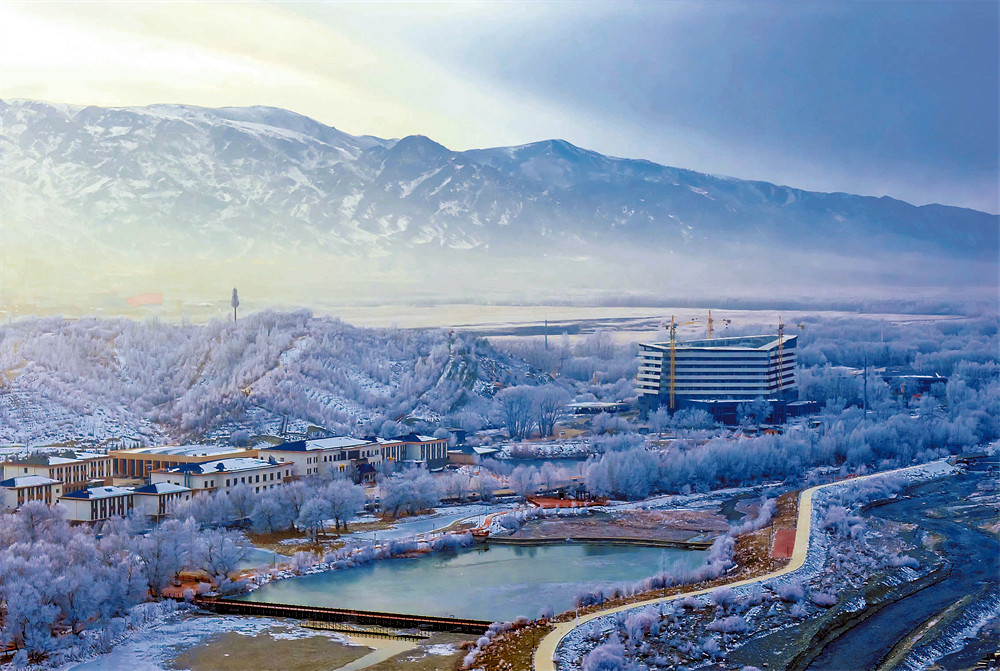 受雾气和低温天气影响,温泉县城披上银装,呈现满城雾凇奇观。