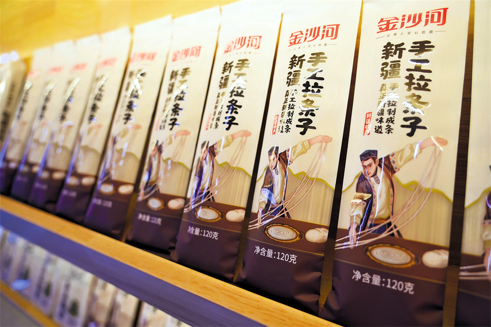 智能化生产线上,金黄的麦粒被源源不断送入机组,经数十道工序蜕变成雪白面粉;制面车间里,面团压成均匀的面片,再切成筋道的拉条子、波纹分明的葱油面;包装线旁,机械手精准抓取、封装、贴标,一箱箱成品粮整装待发。“哈麦面筋道,葱油面香浓,产品根本不愁卖!”史千莎说。