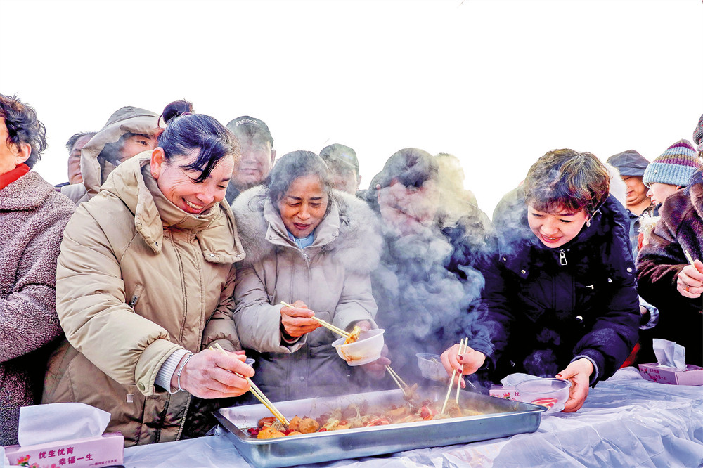 篝火旁的火锅品尝区同样人声鼎沸,数口铁锅在雪地里一字排开,丰富的食材在锅里沸腾,鲜香热气在清冷空气中四散开来,近百名食客围炉同食。