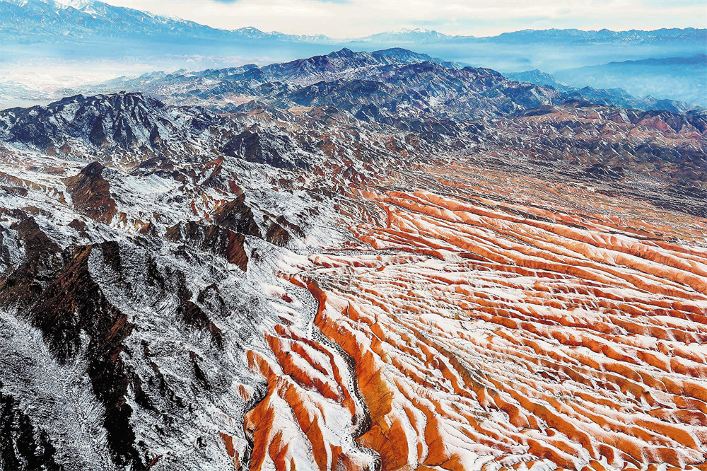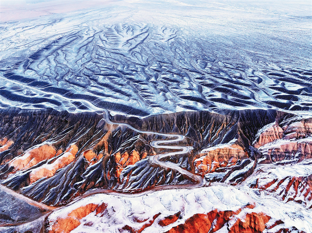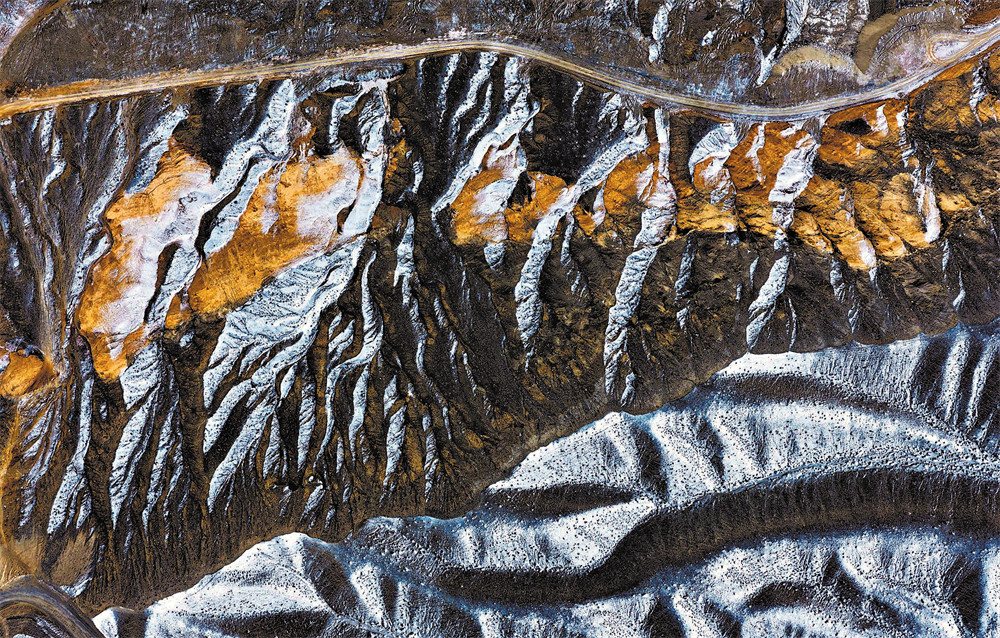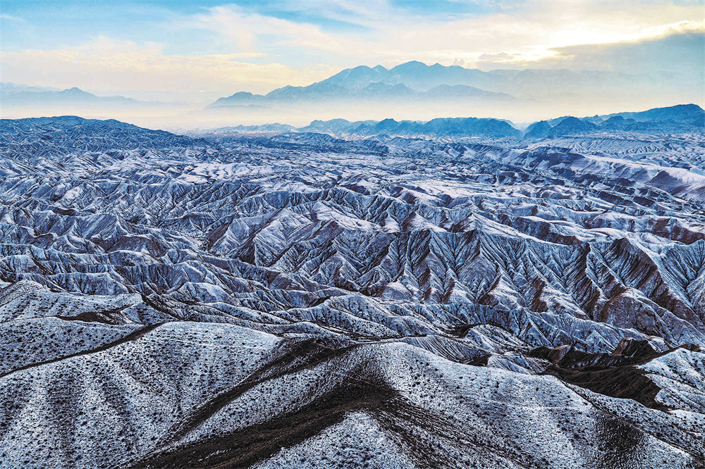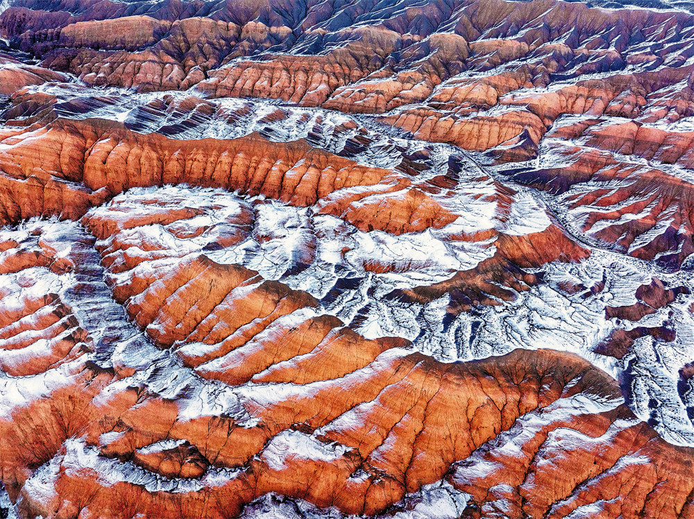 这里的雅丹地貌群,在夏日或许是土黄与赭红的炽热交响,此刻却被白雪重新诠释。雪并未完全覆盖风蚀的痕迹,而是温柔地落入沟壑,轻覆台地,让风雨雕刻的线条更加分明。一座座土丘,在雪的勾勒下,犹如大地的浮雕,在阳光下,拖出长长的阴影。