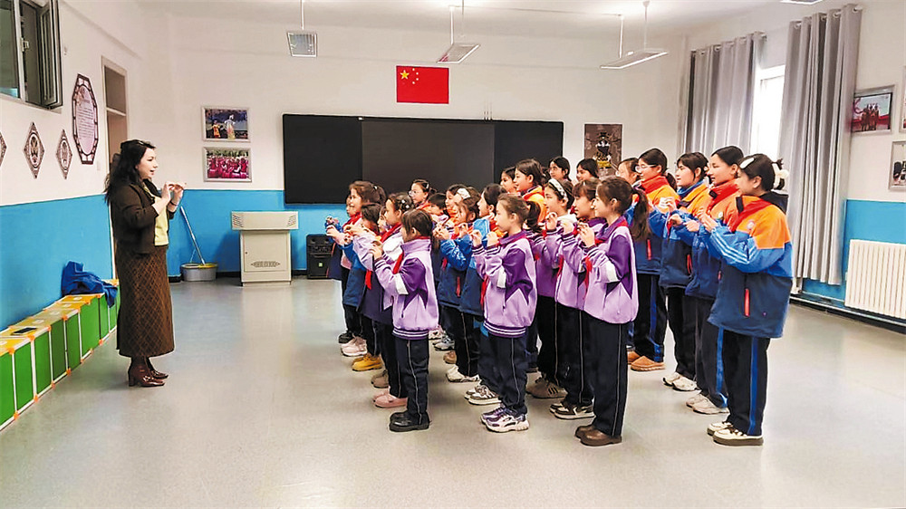 “看到演员们帽子上闪亮的饰珠,随着身段轻轻摇动,美极了,我一下就迷住了。”六年级学生麦热瓦热·艾木拉瓦回忆最初接触京剧时的情景,眼睛依然发亮。让她和同学们踏入这扇传统艺术之门的引路人,正是学校的音乐教师米也斯尔艾。