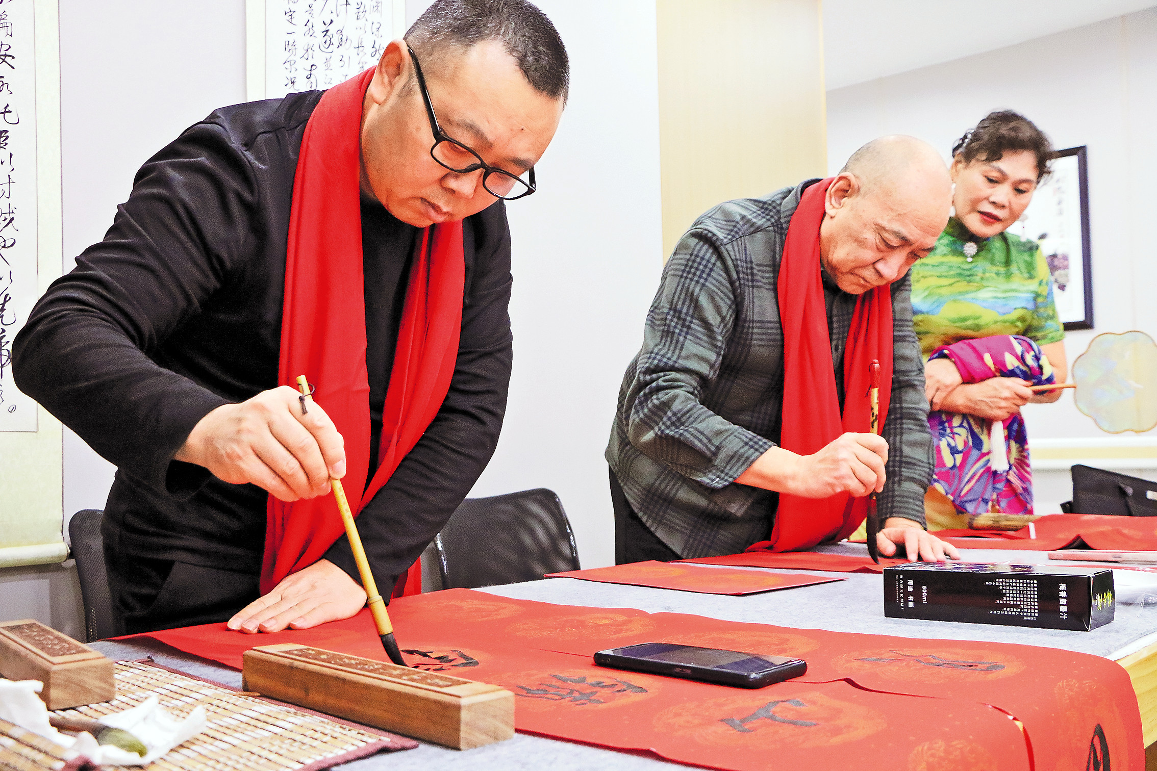 1 月 15 日,书法家在博乐市青达拉街道健康路社区活动室写春联。