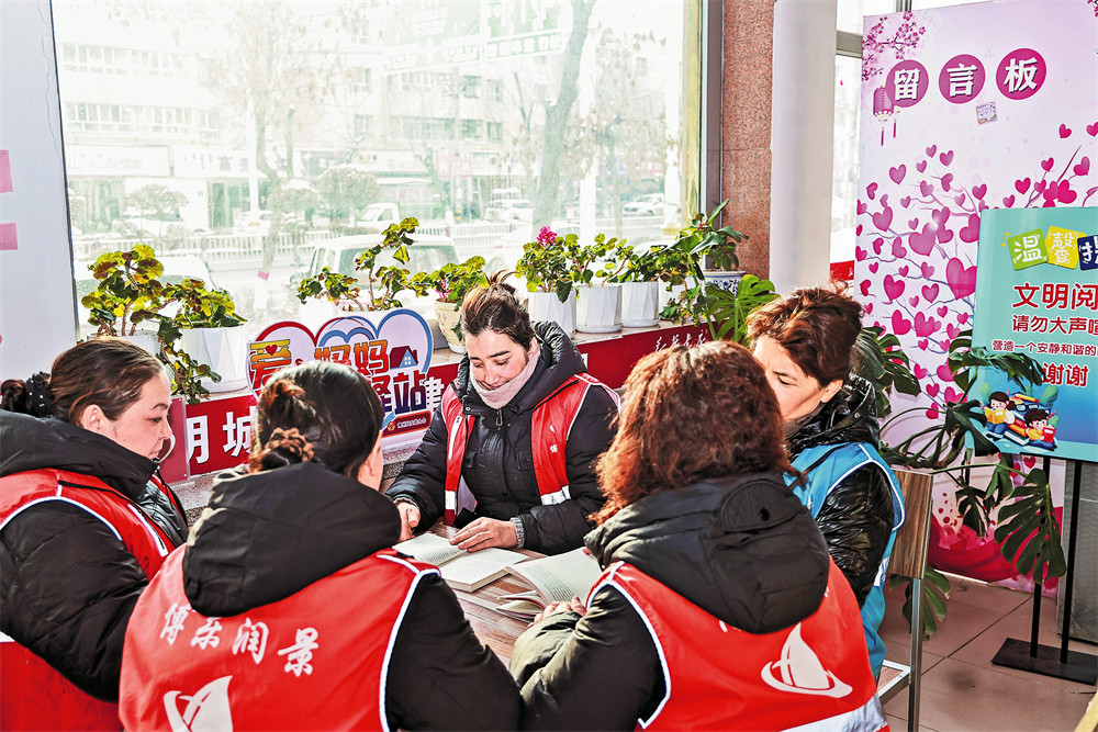 1月20日,在博乐市青得里大街爱心妈妈驿站内,环卫工人正在阅读。