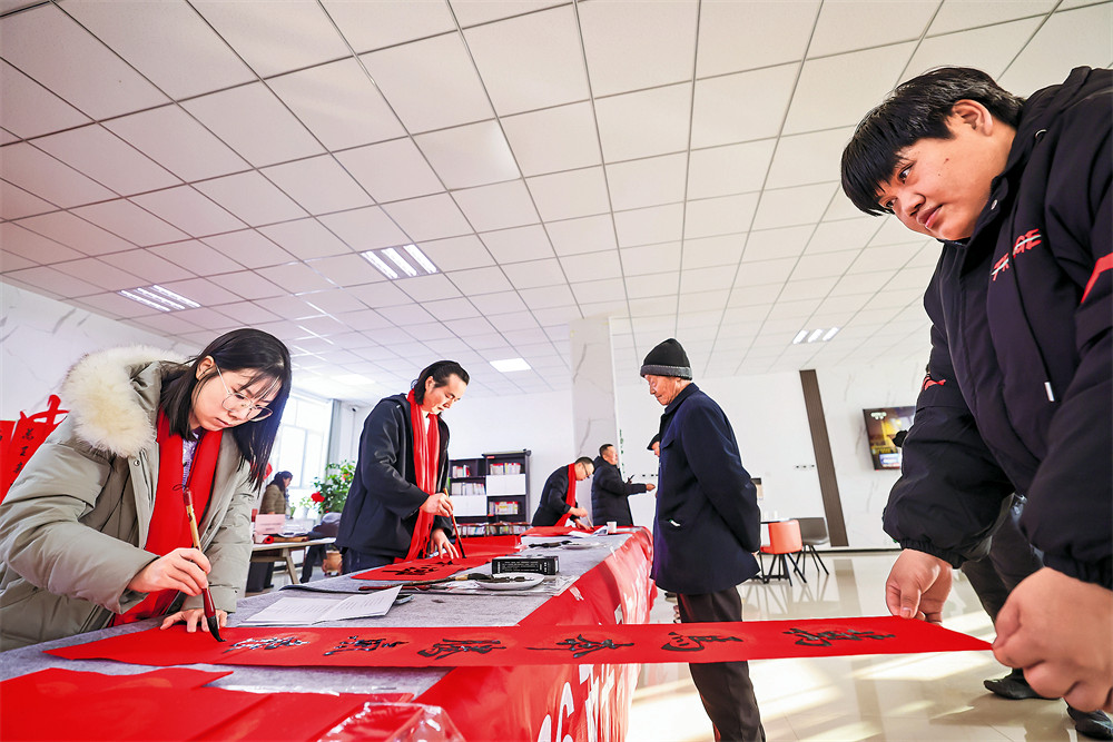 1月19日,博乐市小营盘镇当合尔特布拉格村文化室内,书画家为村民书写春联。