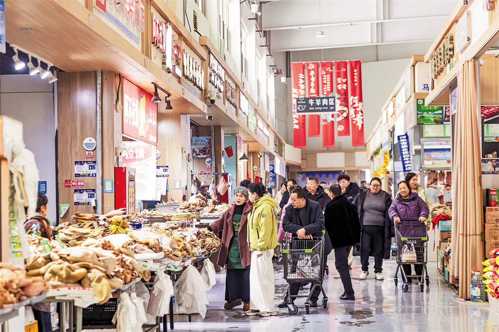 进入农历腊月后,市场里挂满了喜庆的红色装饰,各区域人头攒动,各类年货琳琅满目、供应充足,呈现出购销两旺的红火景象。 (记者楠登 摄)