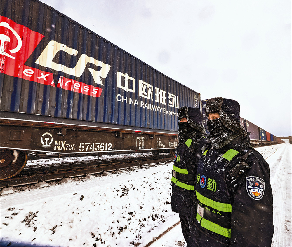 民警冒雪守护中欧班列。 (记者齐丽格尔 摄)