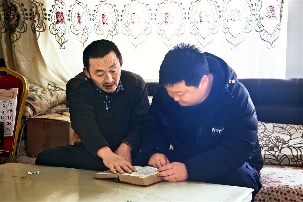 赵玉玺(右)和父亲查阅资料。 (记者靳蒙蒙 摄)