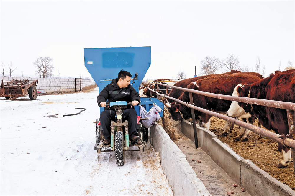 2月3日一早,温泉县育文养殖专业合作社逐渐热闹起来。27岁的赵玉玺与父母一如往日地开始忙碌,母亲赵淑琴驾驶电动撒料车精准投料;他则和父亲郭育文清理粪污、察看牛的长势,一家人拉开新一天的养殖劳作。
