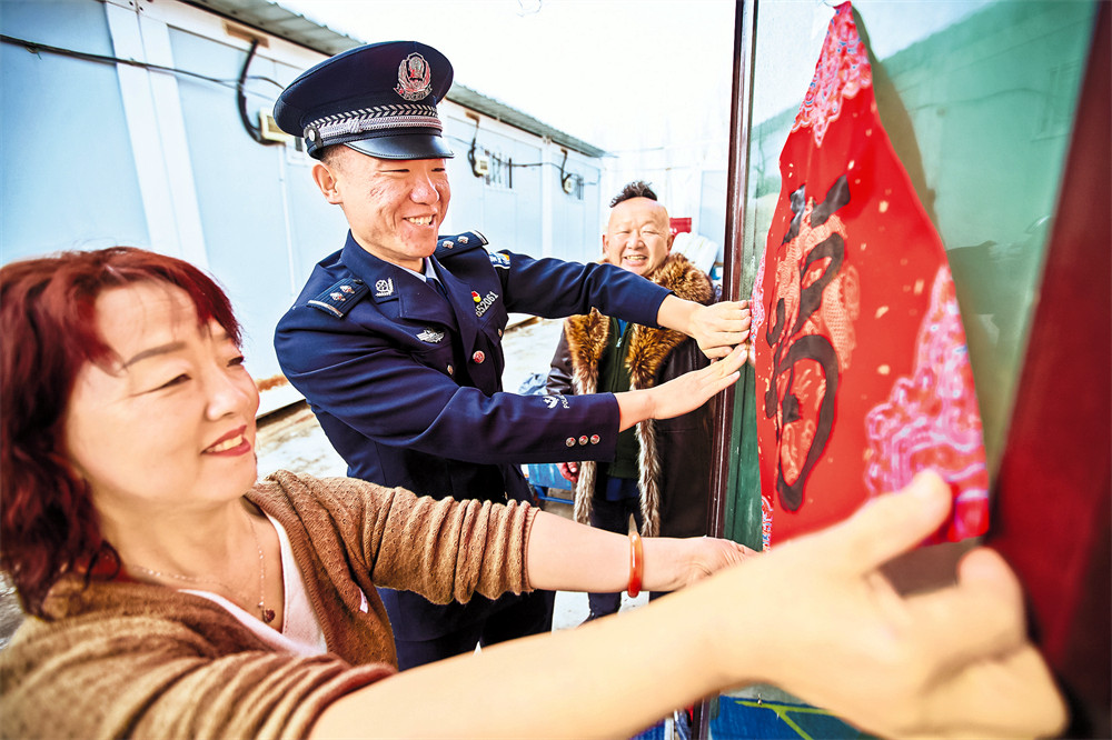 2月10日,博州边境管理支队温泉边境管理大队加肯布拉克边境派出所民警与群众一起贴“福”字。