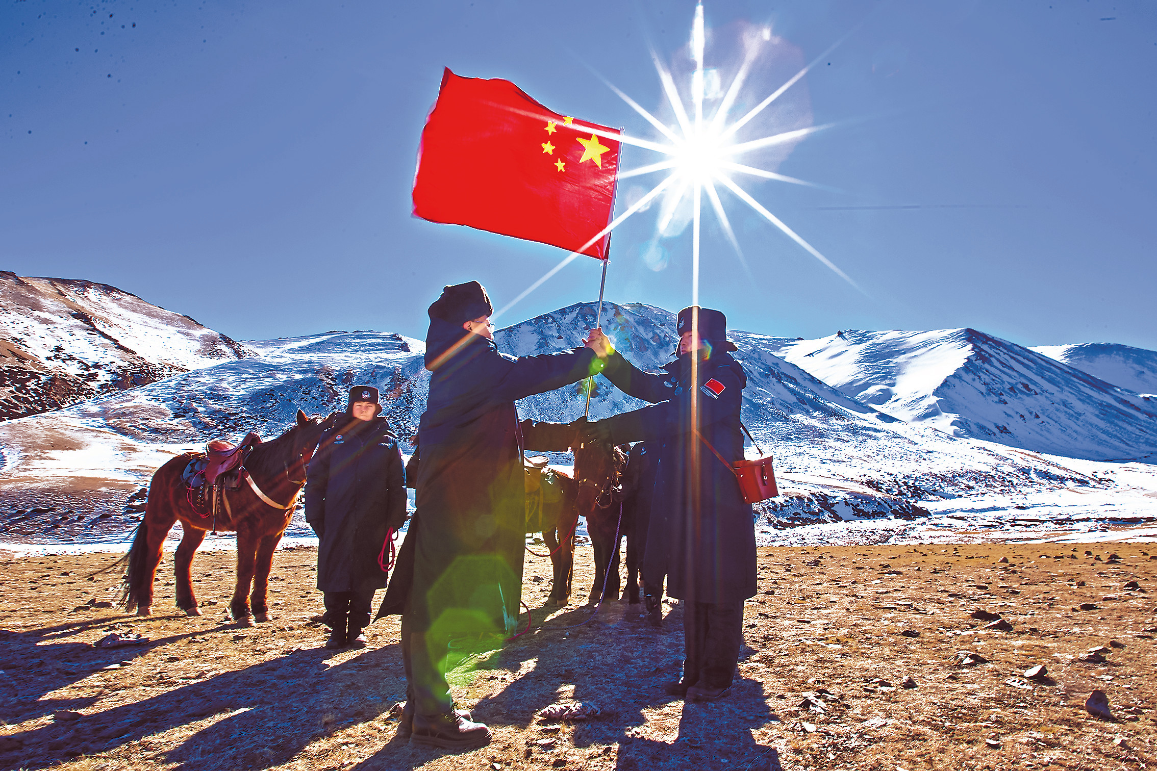 民警高举五星红旗巡边踏查。(通讯员芦胜磊 摄)