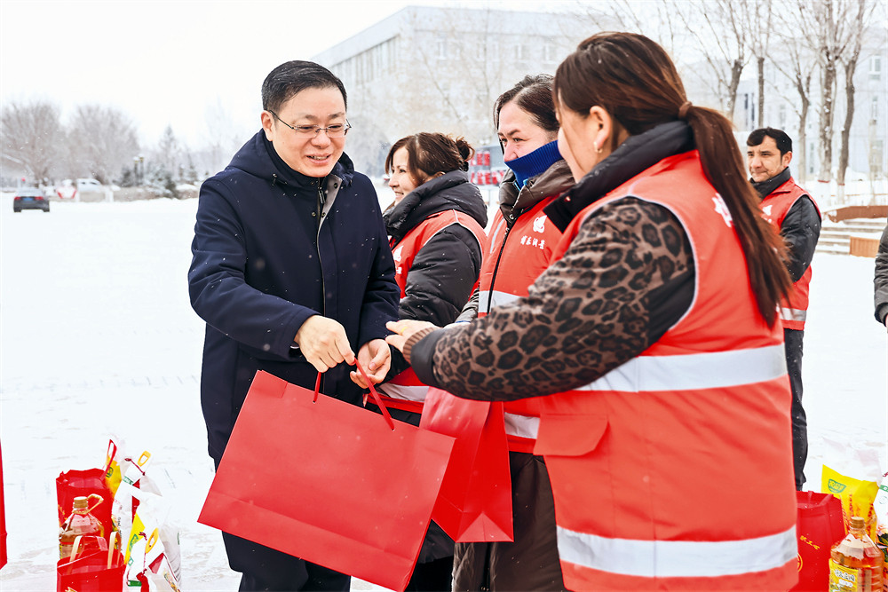 2月14日,自治州党委书记王贵驷亲切看望环卫工人。 (记者赵震东 摄)