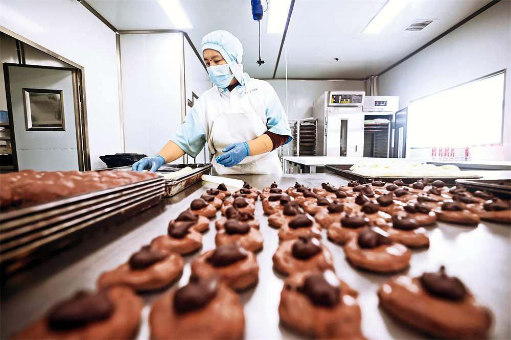 2月25日,博乐市青得里镇定吉格村小微产业园内,博州雅绘食品生产有限公司员工在制作糕点。