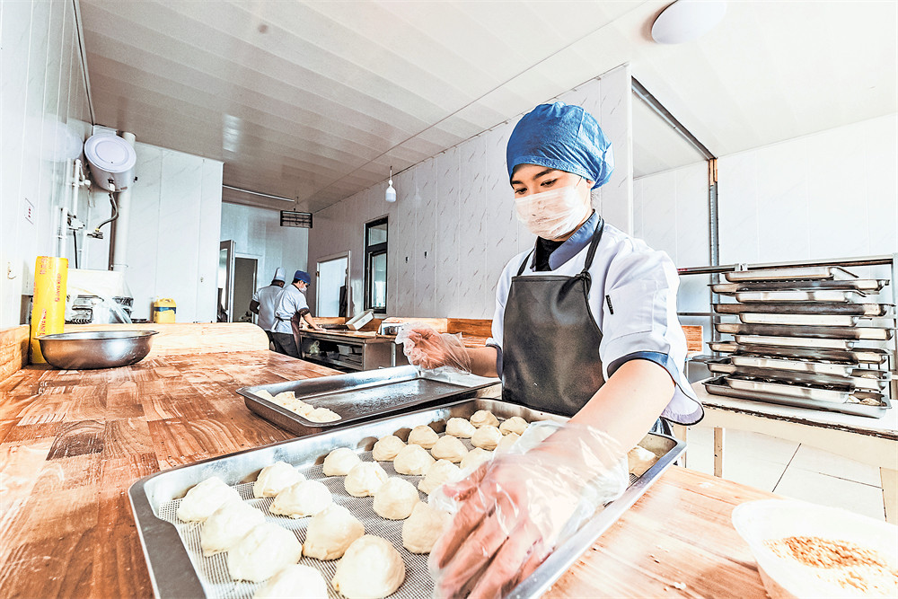 在园区的另一侧,博乐市艾尔肯师傅面食加工厂同样热火朝天。负责人艾尔肯正和工人们一起将刚制作好的油塔子、花卷等面点装袋,准备发往各销售点。