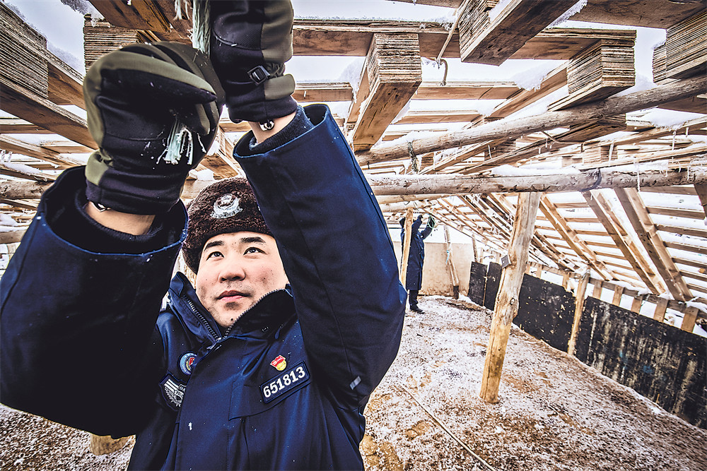 叶尔兰仔细察看羊圈,伸手摸了摸围栏根部的土,确认木桩松动情况,随即从车上取出铁丝和半卷旧毡布。他将松动的木桩砸实,把铁丝拧紧,再将毡布固定在迎风那面,寒风灌不进羊圈了。