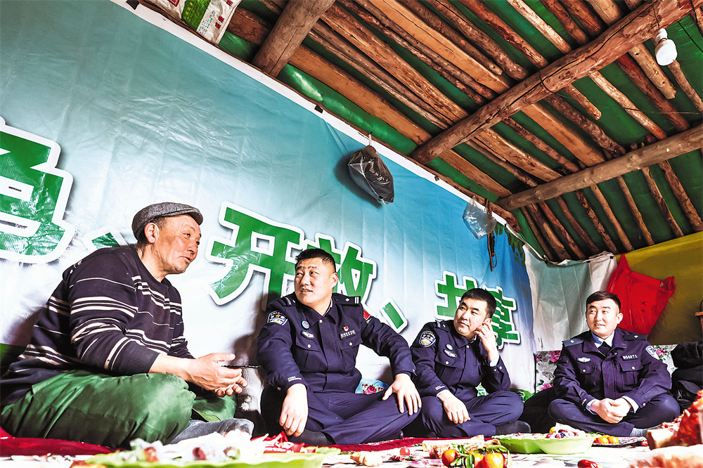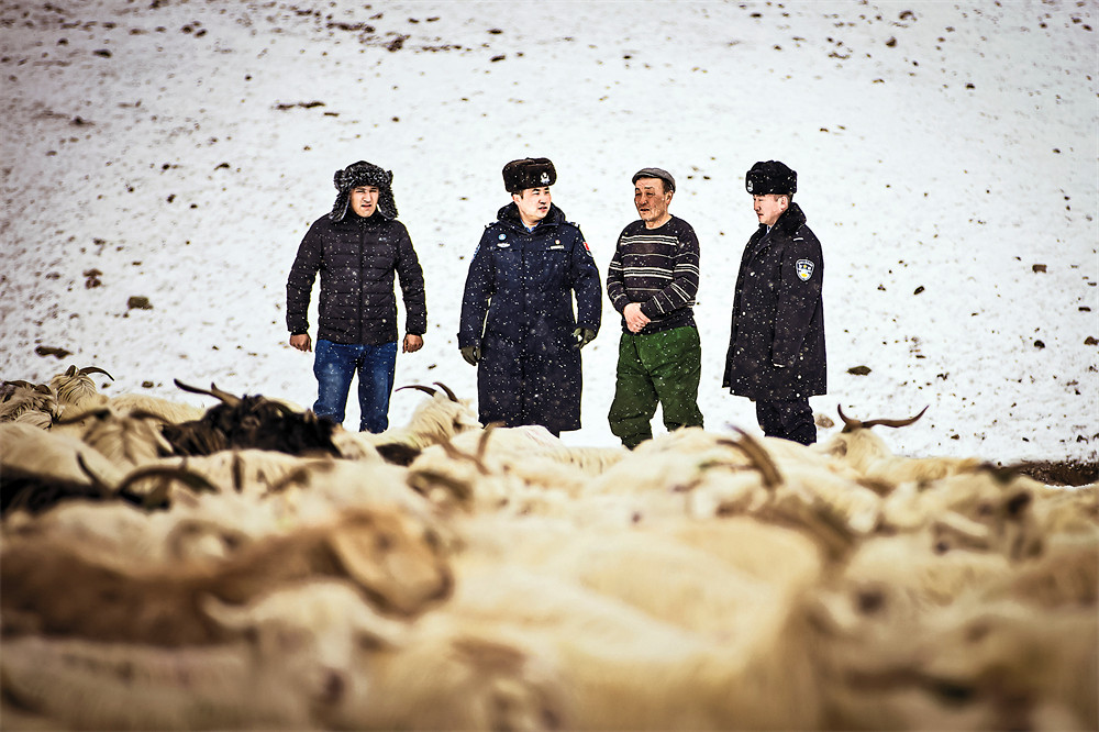 在海拔3000米的冬窝子,始终有一抹藏青蓝的身影,穿梭在山间小道、连绵山谷之中,他用脚步丈量着辖区的每一寸土地,守护着牧民的安全,他就是博州边境管理支队海西边境派出所托布里哈提警务室民警叶尔兰。
