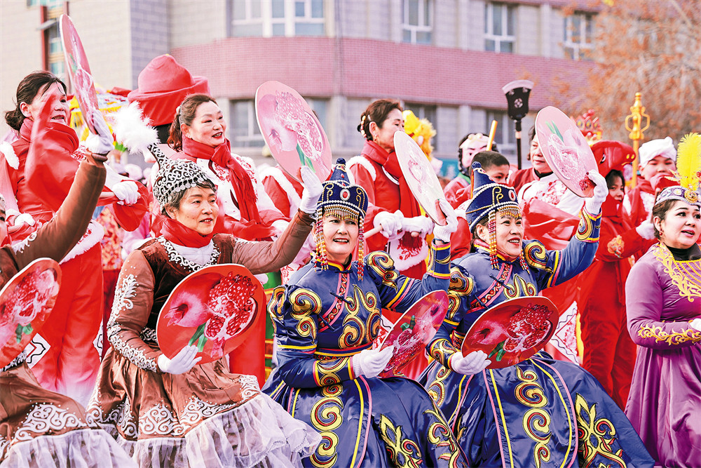 在精河县,展演队伍浩浩荡荡行进,欢呼声、喝彩声此起彼伏。舞龙威风开场,骏马方阵气势昂扬,舞狮腾跃灵动,与锣鼓节奏相得益彰;秧歌轻盈多姿,各民族歌舞轮番上演,传统民俗与多民族文化交融生辉;非遗方阵中,剪纸、刺绣等传承人现场展示技艺,尽显匠心。“今年,我们一家四口都来参加了社火表演。大家反复排练,虽然辛苦,但听到观众的喝彩感觉特别自豪!”大河沿子镇浩斯托干村村民赵翠萍说。