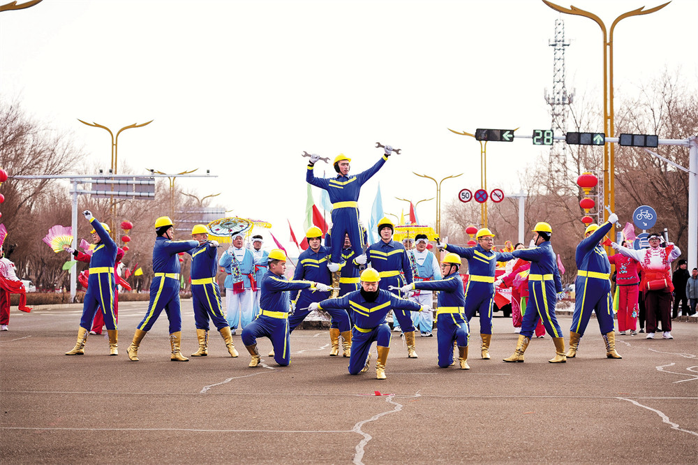 在阿拉山口市,“龙狮耀新春”方阵率先登场,本土舞龙舞狮队融入马年元素开场;“非遗传社火”方阵演绎腰鼓、扇伞、傩戏等非遗技艺;“五彩同心梦”方阵汇聚多民族代表队同台共舞;“疆潮展新锐”方阵展现口岸发展的现代活力与开放气质,彰显一马当先的奋进姿态。阿拉套街道党群服务中心干部靳彦彦,是“工业形象”方队的一员。他说:“能为家乡的元宵佳节添一份热闹,把口岸职工的精气神展现出来,我觉得特别有意义。”