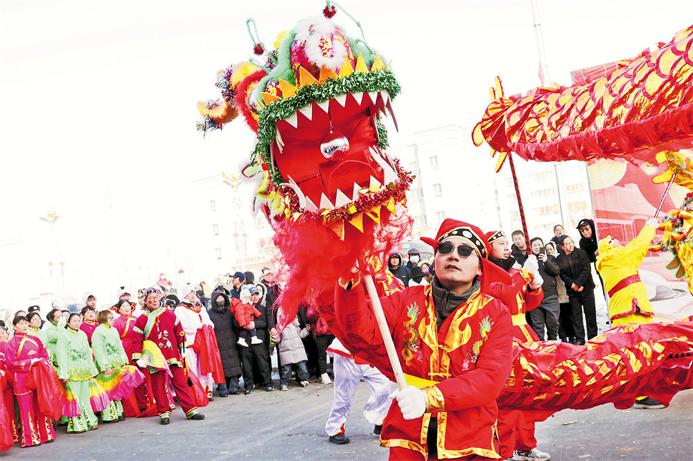第五师双河市社火展演现场热闹非凡、喜气洋洋。气势磅礴的威风锣鼓铿锵有力、振奋人心;灵动威武的舞龙舞狮辗转腾挪、活灵活现;欢快喜庆的秧歌彩扇飞舞、绸带翩跹,将团圆喜悦融入舞步;惟妙惟肖的划旱船摇曳生姿、诙谐有趣,尽显传统民俗独特魅力。“今天是元宵节,专门带家人来看社火表演,节目很精彩,节日氛围非常浓厚。”双河市民加依达尔·阿力扎提说。