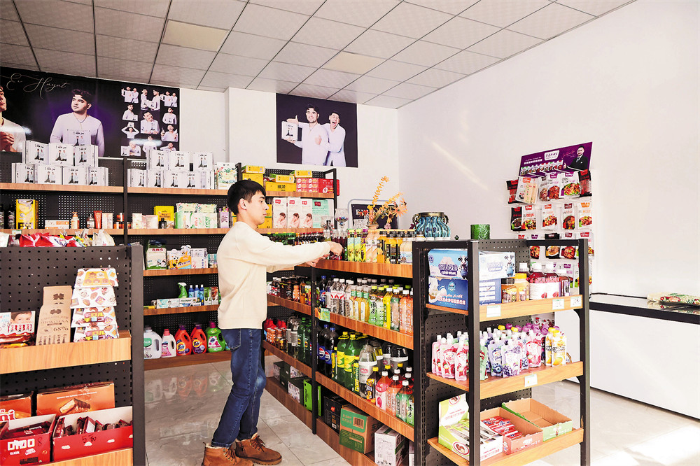 今年1月初,爱利依木然超市正式开业。依木然从流动小摊摊主变成了超市负责人,还代理了一个洗发水品牌,引进了本地和疆内特色产品。开业以来,每天都有三四百元收入。