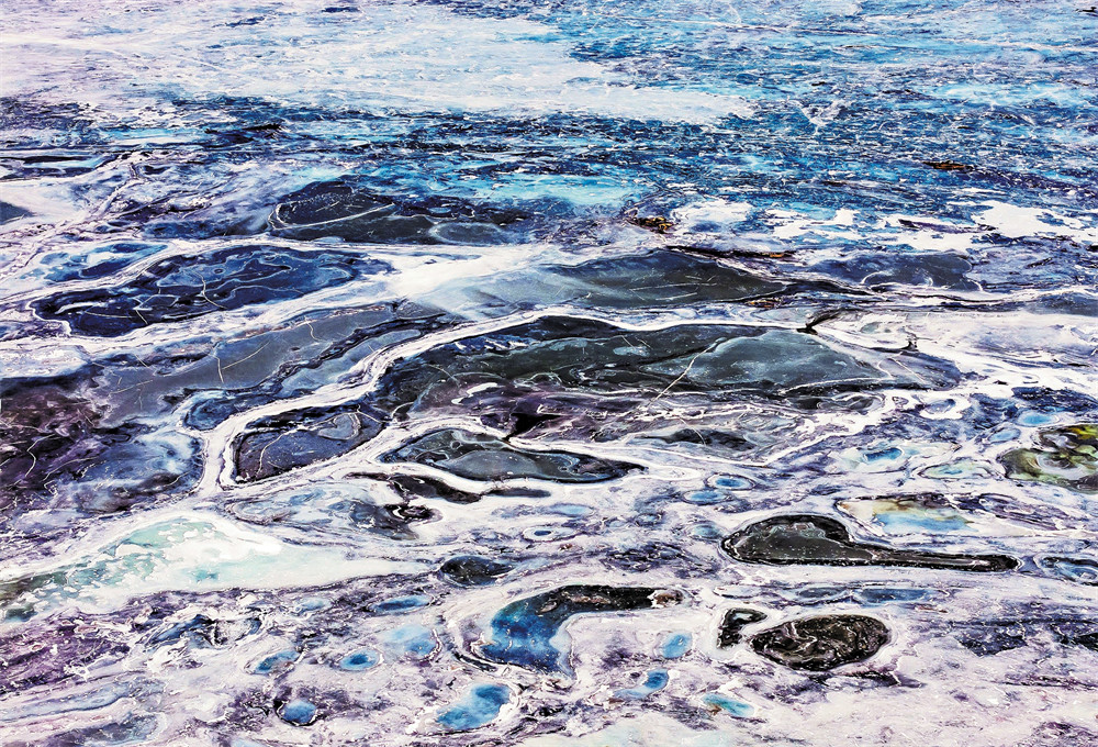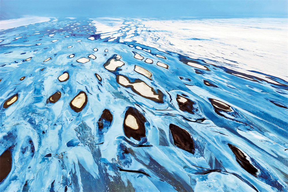 从空中俯瞰,艾比湖的冰面像一幅抽象画。隆起的雪在蓝色的冰层上堆叠出万千形态——有的像沟壑纵横的山川,有的如支脉延展的河流,还有的仿佛开启了神秘荒凉的世界。风把积雪吹成一道道波纹,凝在冰面上,成了最独特的印记。