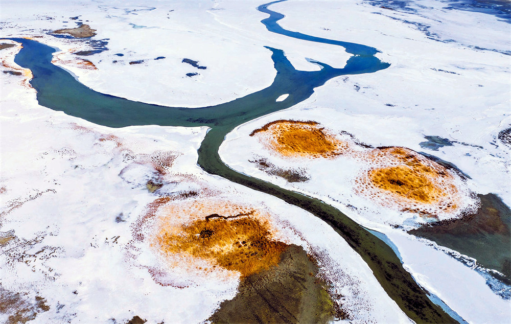 冰面之下,生机悄然涌动。精河河水从湖口向湖中汩汩流淌,所到之处留下幽蓝的冰痕。远远望去,那冰痕似一棵静静生长的生命之树,镌刻着冬天的旅程,也孕育着春天的希望。