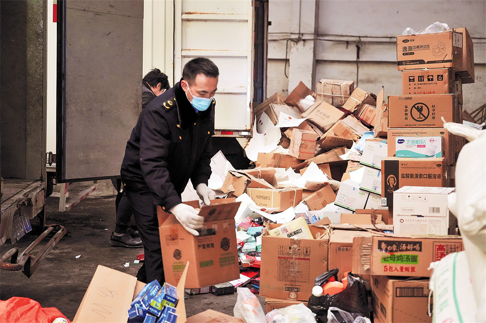 抵达处理场地后,执法人员有条不紊地将各类假冒伪劣商品从运输车辆上卸运至指定处置区域,工作人员严格按照无害化规范处置。待现场处置工作准备就绪,随着统一指令的下达,大型破碎处置机械依次将各类假冒伪劣商品推送至处置设备内,完成销毁作业。