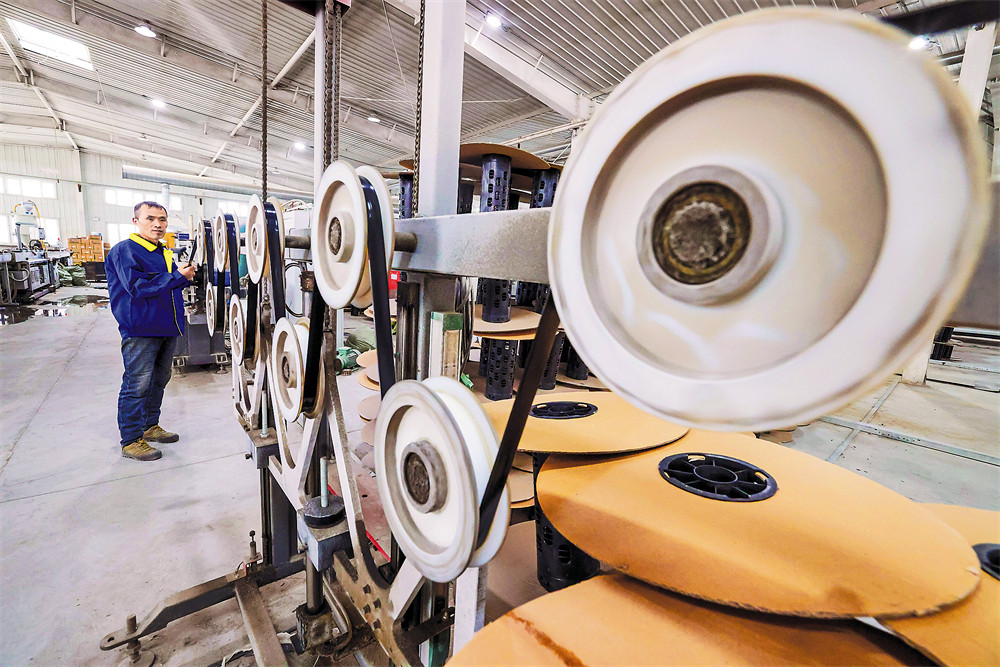 3月17日,精河县兴晟塑业有限公司滴灌带生产车间里,员工在作业。