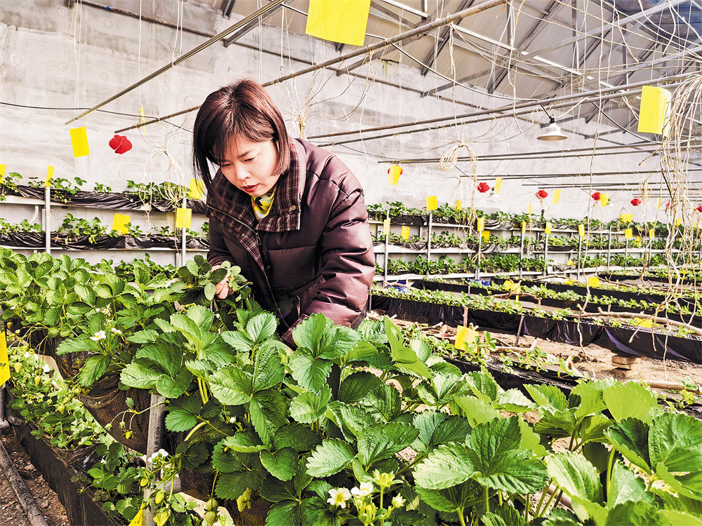 3月18日,在博乐市贝林哈日莫墩乡决肯村大棚蔬菜种植基地的种植大棚内,种植户正在为草莓苗掐叶、清理杂草。