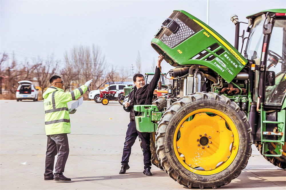 3月23日,精河县大河沿子镇农机安全技术人员开展农机检验工作,为春耕生产保驾护航。