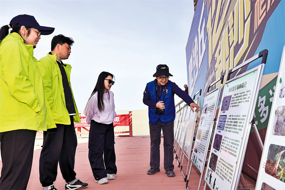 4月1日,在精河县木特塔尔沙漠景区,爱鸟社工作人员为游客介绍博州鸟类品种及栖息环境。