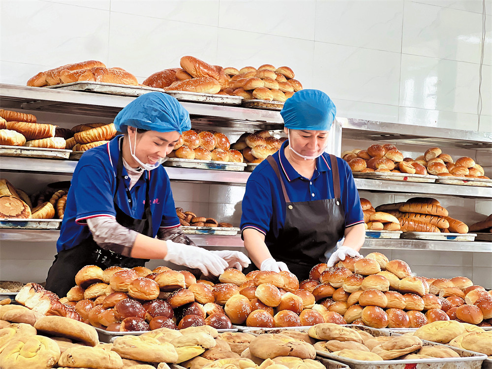 4月1日,精河县希望之光商贸有限公司生产车间内,员工正在整理刚出炉的面点。