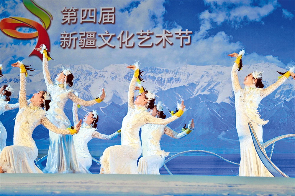 原创歌舞诗《爱在赛里木湖》在赛里木湖景区游客中心精彩上演。 (记者曼热帕·阿迪力江 摄)