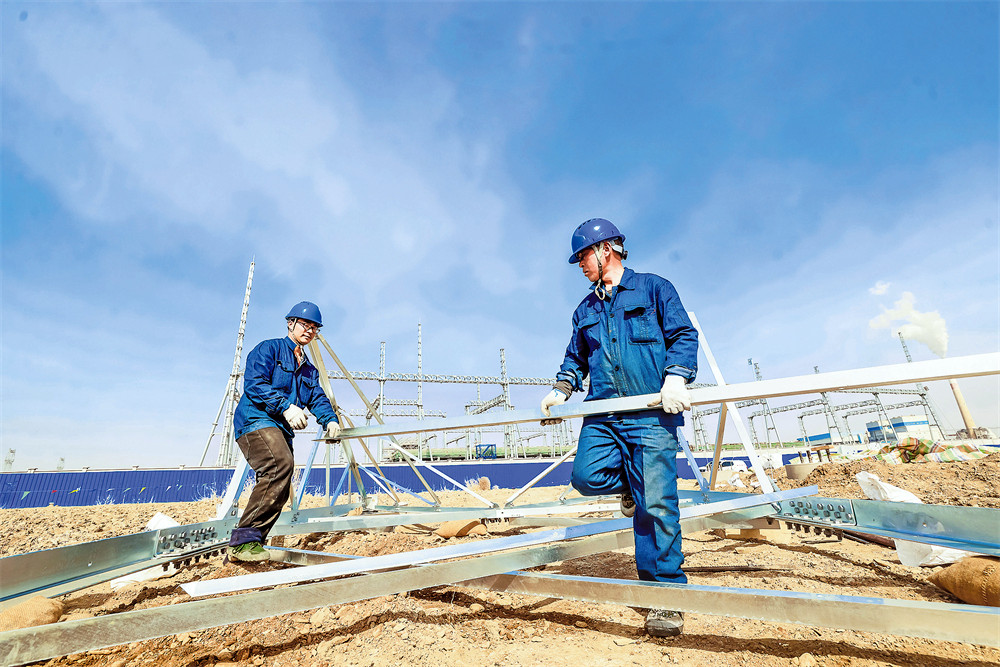 4月3日,博州城东220千伏输变电工程正加紧建设,施工人员有序安装设备。