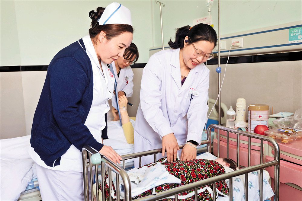 曾为红(右)察看新生儿健康状况。 (通讯员洪德孜·木哈买提汗 摄)